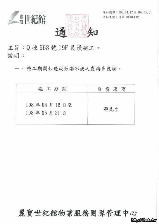 通知文號108014 Q棟663號19樓裝潢施工公告