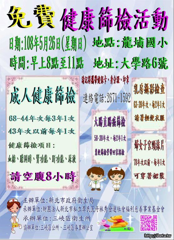 三峽衛生所5/26(日)免費成人健檢-龍埔國小