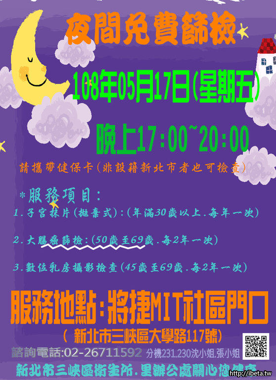 三峽衛生所5/17(五)夜間社區健康篩檢-將捷MIT社區門口