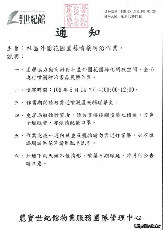 通知文號108017 社區外圍花圃園藝噴藥防治作業