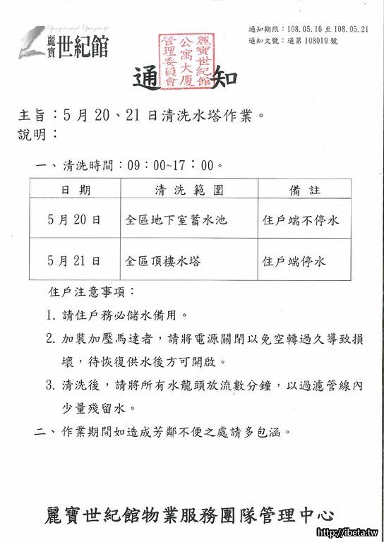 通知文號108019 5月20、21日清洗水塔作業