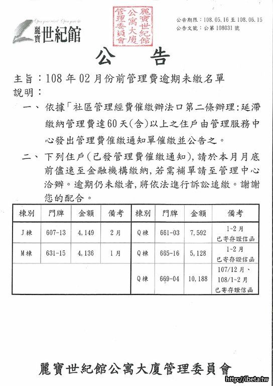 公告文號108031 108年02月份前管理費逾期未繳名單