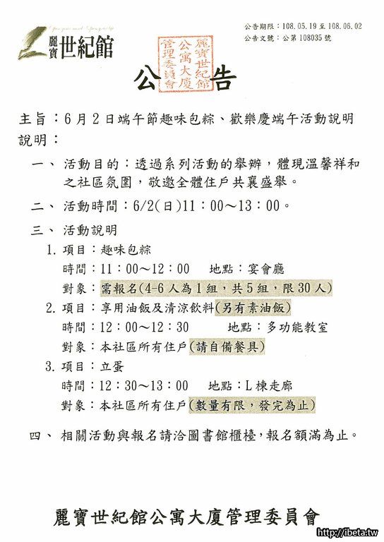 公告文號108035 6月2日端午節趣味包粽、歡樂慶端午活動說明