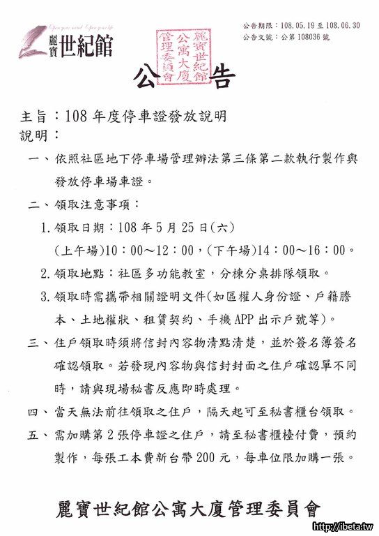 公告文號108036 108年度停車證發放說明