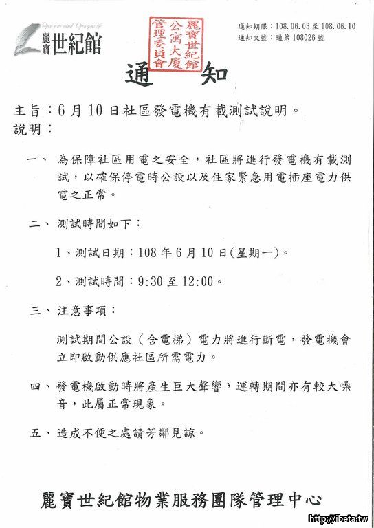 通知文號108026 6月10日社區發電機有載測試說明