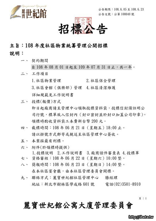 公告文號108040 108年度社區物業統籌管理公開招標