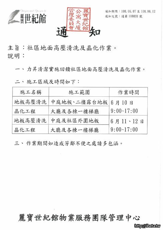 通知文號108031 社區地面高壓清洗及晶化作業