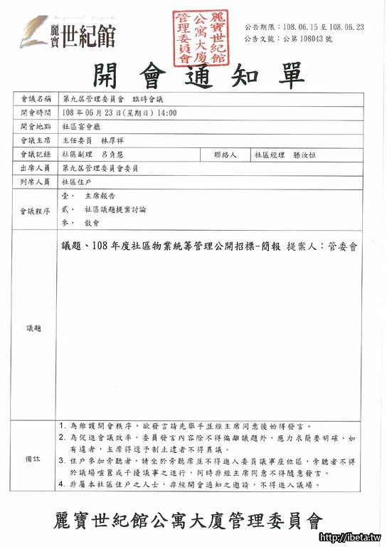 公告文號108043 第九屆管理委員會 第二次臨時會議