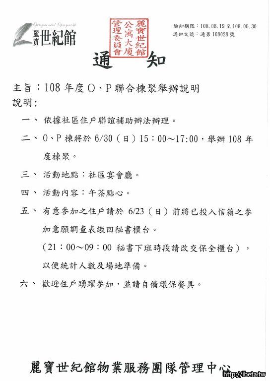 通知文號108028 108年度O、P聯合棟聚舉辦說明