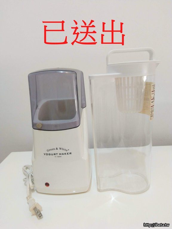 2. 插電優格機,受贈,已超過10年以上,從未使用過但還能通電使用。每次都需自行購入全脂鮮奶和優格菌粉或無糖優格才能自製優格。旁邊2L冷水壺為參考比例用,含把手高30。無說明書和保證書。