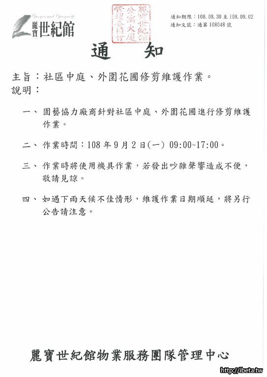 通知文號108048 社區中庭、外圍花圃修剪維護作業