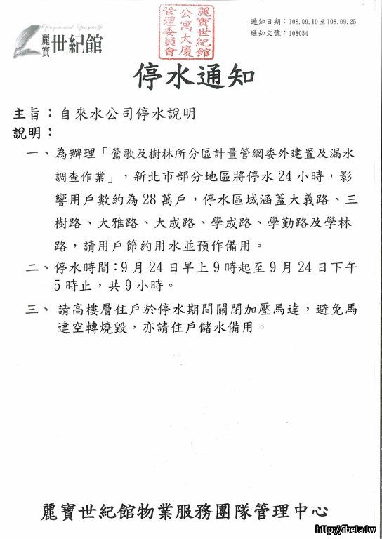 通知文號108054 自來水公司停水說明