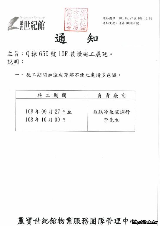 通知文號108057 Q棟659號10F裝潢施工展延。