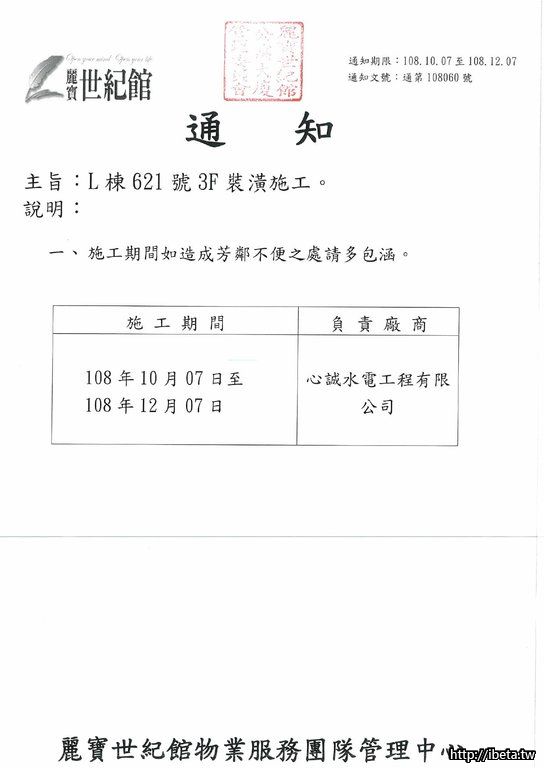 通知文號第108060 L棟621號3F裝潢施工