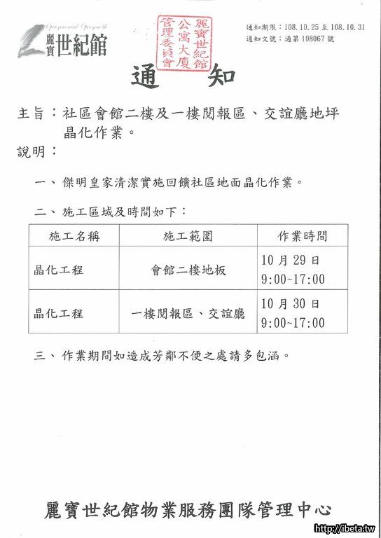 通知文號108067 社區會館二樓及一樓閱報區、交誼廳地坪晶化作業