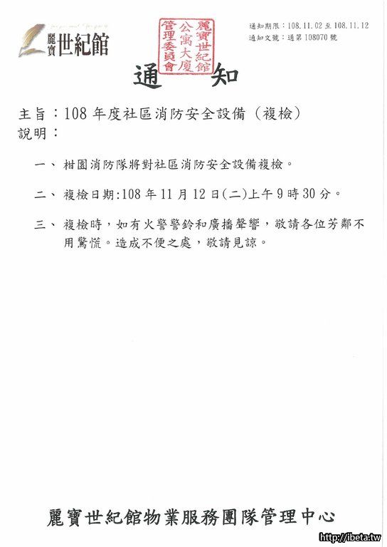 通知文號108070 108年度社區消防安全設備(複檢)