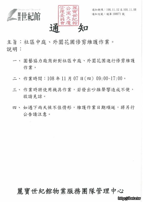 通知文號108071 社區中庭、外圍花圃修剪維護作業