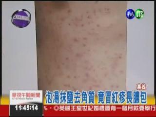 提醒民眾,泡湯真的要小心,高雄有民眾去泡湯時,先用鹽巴搓揉身體,想要去角質,沒想到,卻造成皮膚出現小傷口,接著又泡熱水,結果感染了綠膿桿菌毛囊炎,全身長滿疹子。
