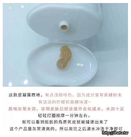 品牌 冰韻;產品名稱 黃糖去角質按摩膏凈含量 :90ml適合膚質 任何膚質凝露質地,黃糖的香味~質地非常水潤,塗到皮膚上輕塗搓開會化成水,輕輕打圈一分鐘後,就可以看到髒髒的角質死皮被搓揉出來了,清水沖淨幾可~同時還兼有護膚、保濕、營養皮膚等功能~使面部肌膚柔嫩光潔