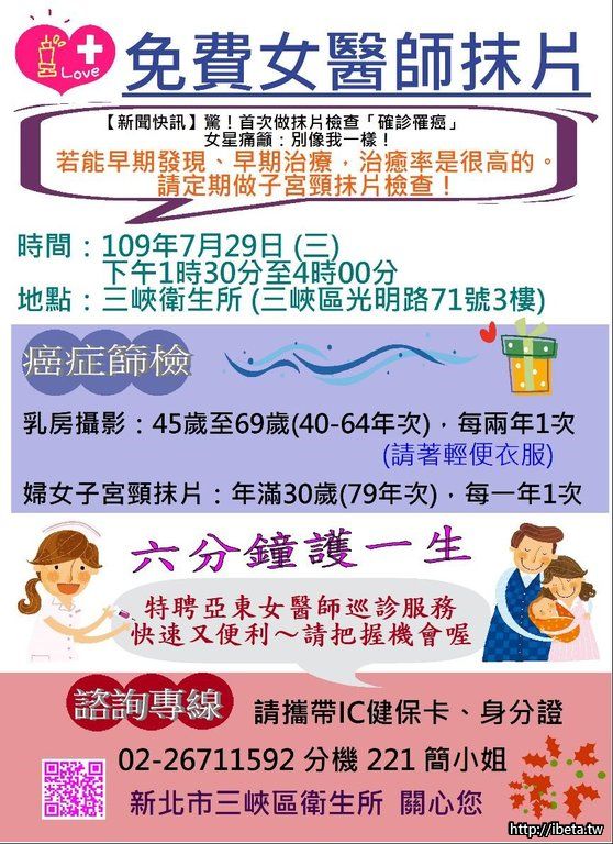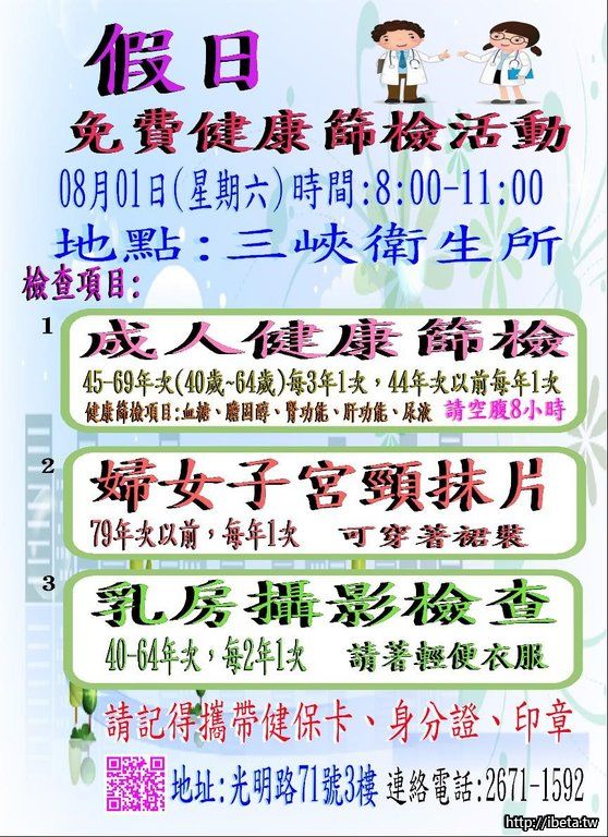 三峽衛生所7/29(三)女醫師抹片檢查.8/1(六)假日成人健檢