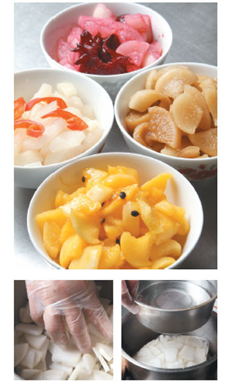 1.蘿蔔連皮洗乾淨切片,加入約1%的鹽,搓揉後用重物壓1天,去除水分、增加脆度,及減少蘿蔔辛辣味。
