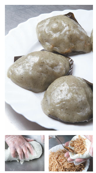 1.粿皮:將糯米粉、蓬萊米粉、糖、水(分次加入)、碎乾鼠麴草、沙拉油揉合成糰,至表面光滑,分割成每個約90公克。