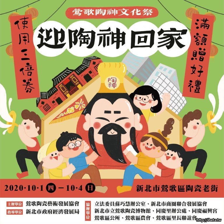 為了恭迎陶神,主辦單位特別選在10月1日到4日中秋連假期間,於鶯歌老街商圈辦理「鶯歌陶神文化祭 迎陶神回家」活動。屆時不僅有熱鬧的文化遶境,在地店家更會推出一連串消費滿額贈精美小禮品的優惠活動,還有許多精彩表演、商品競標,邀請大家一起來認識鶯歌在地陶瓷文化!
