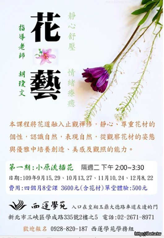 費用:四個月8堂課 3600元(含花材)單堂體驗:500元 [需於3日前報名]