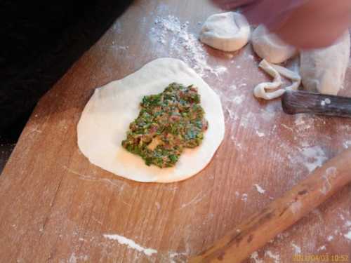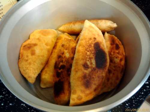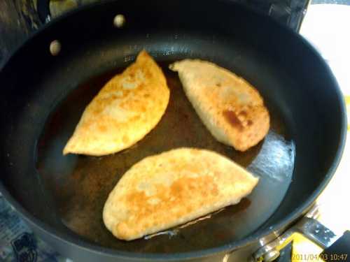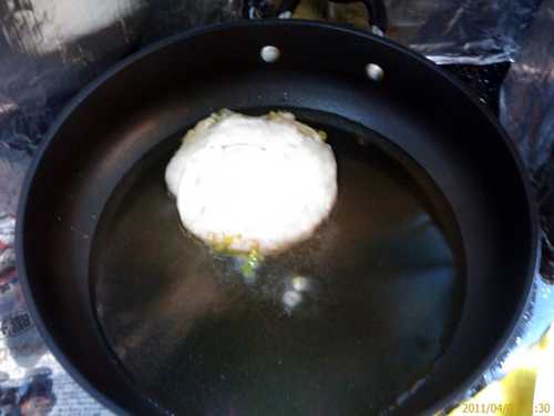 平底鍋內,放上少許的油,將韭菜盒下鍋油炸.