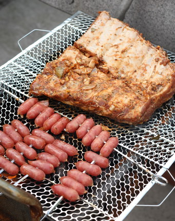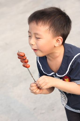 小子已經忍不住先嘗剛烤好的香噴噴香腸串了!