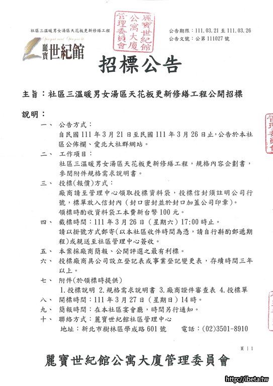 主旨:社區三溫暖男女湯區天花板更新修繕工程公開招標