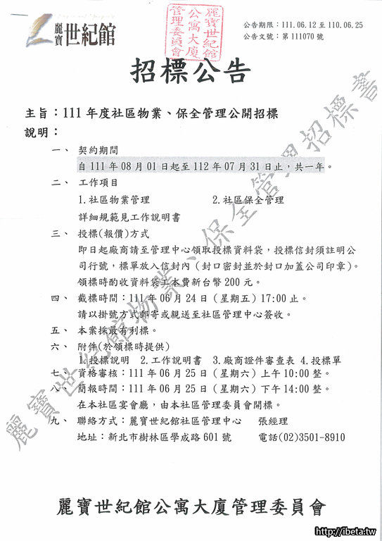主旨:111年度社區物業、保全管理公開招標
