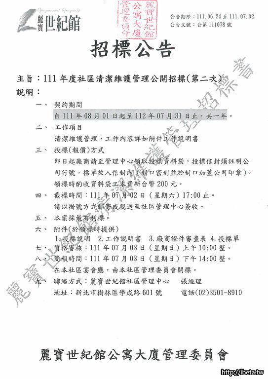 主旨:111年度社區清潔維護管理公開招標(第二次)