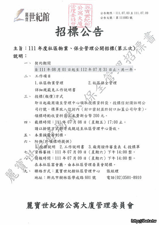 主旨:111年度社區物業、保全管理公開招標(第三次)