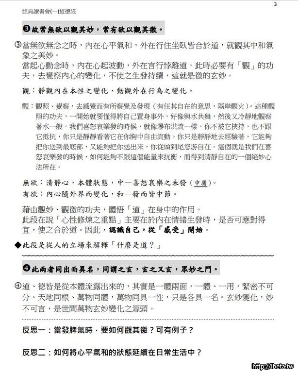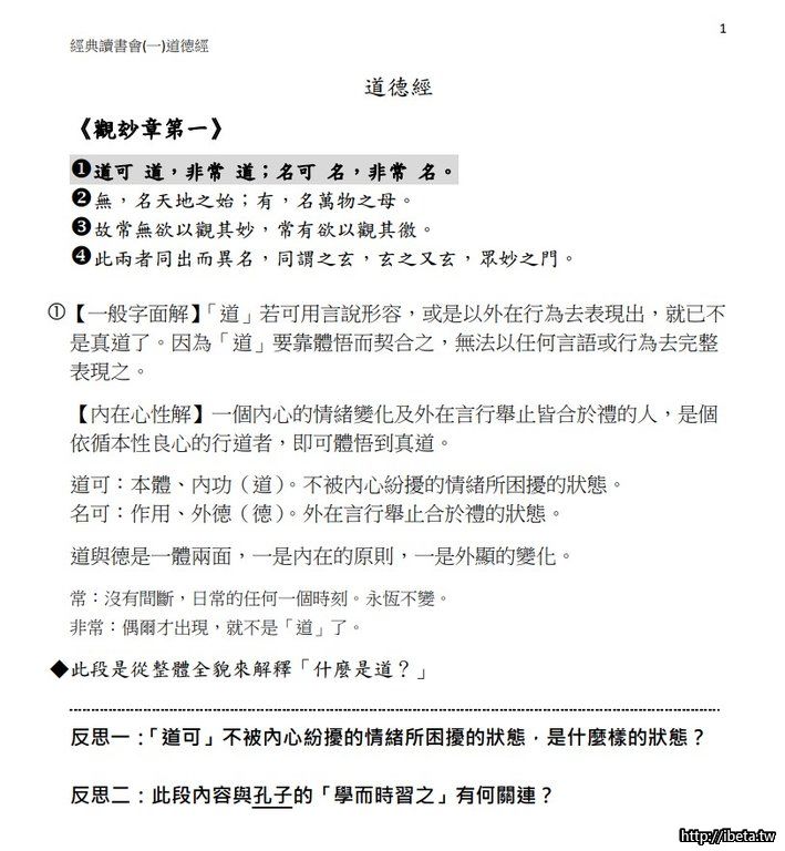 我們大膽的釋解第一章:道可,名可,是自己的內心不受情緒干擾,以及言行不受外在影響的中和狀態⋯⋯這應是釋義的眾多書籍中所未見的。[font=inherit]當然,經典大義有多方解釋,但是,都應不離自身才是正解。所以,光聽[/font][font=inherit]經、讀經無法解其真義,印象也不深刻,因此,才有發起讀書會,共同探討的動機,希望與同好者一同激盪智慧的火花。[/font]