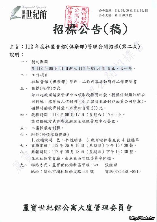 主旨:112年度社區會館(俱樂部)管理公開招標(第二次)