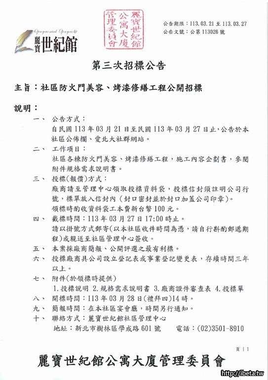 主旨:社區防火門美容、烤漆修繕工程公開招標(第三次)