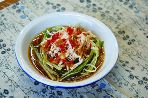 1將雞胸肉燙熟切成絲。