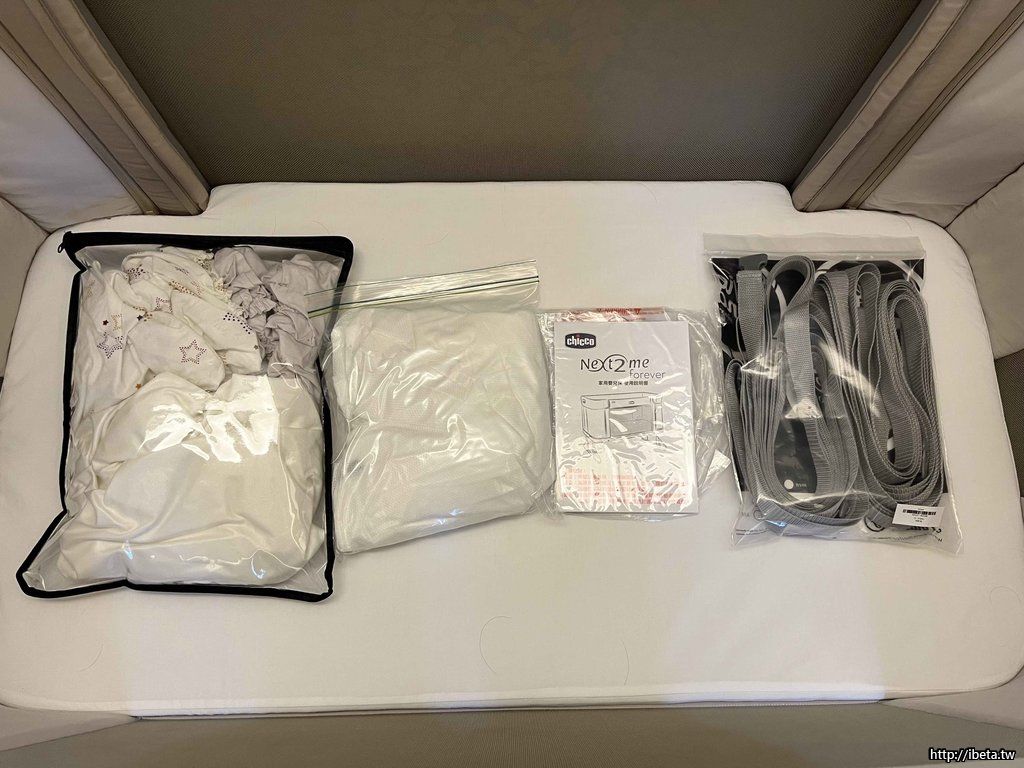 左起為:床包保潔墊、蚊帳、說明書、固定用綁帶