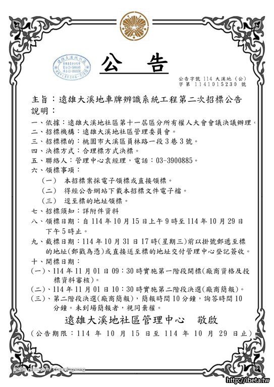 主旨:遠雄大溪地車牌辨識系統工程第二次招標公告