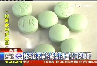 有民眾習慣按照三餐時間,服用健康食品綠茶錠,實際上這號稱能保肝、抗氧化的綠茶錠,就是綠茶濃縮萃取,也就是說把內含綠茶多酚中的EGCG益多酚也濃縮,但劑量如果過高,恐怕不但不能保健,甚至反而傷身。