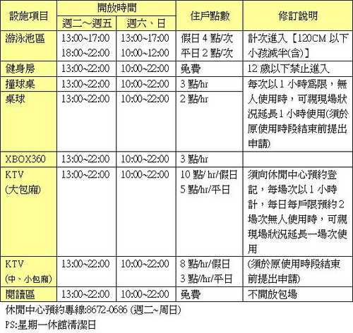 設施項目 開放時間 住戶點數 修訂說明