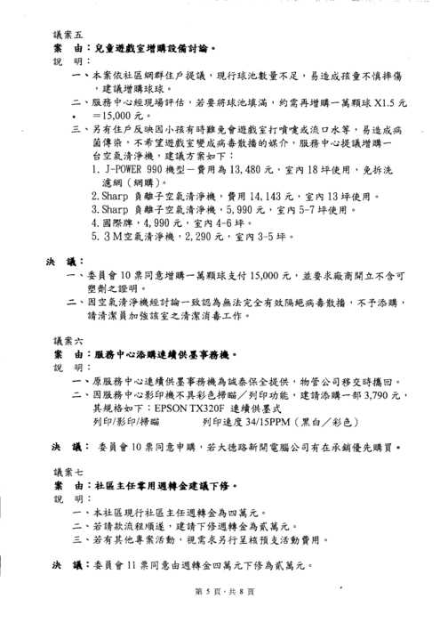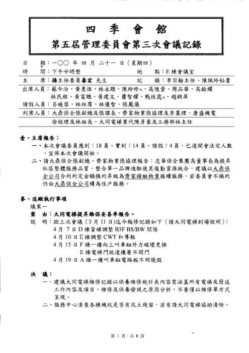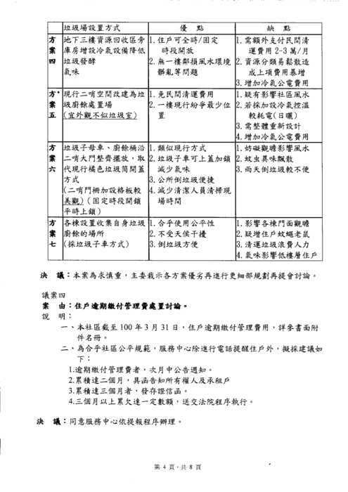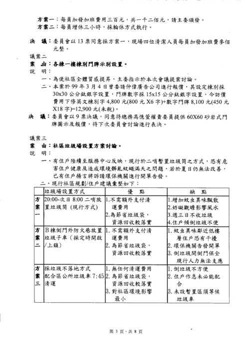 重申委員會立場,垃圾永久性設置地點(方案)委員會僅基於職責蒐羅相關資料與方案,進行優劣分析、經費比較等客觀數據與資料,供區權人大會議決後始得執行,委員會無權替廣大住戶決定此重大議題......監委 永聰{:4_93:}