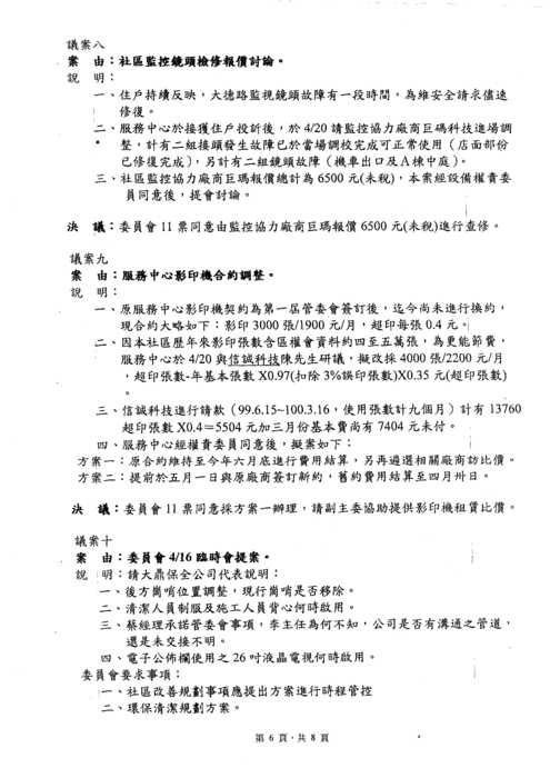 我在去年底(主委任內)驗收的監控系統更新案...150多個鏡頭能修就不換、訊號電源線路整備轉光纖區域網路、三套機房遠端伺服器(光纖區網)、4台(連動)42吋監看系統(警衛室)含空調設備....花了100多萬!<---100萬須經區大同意(區分所有權會議議決),因時效考量故拆成兩個標案來闖關...其實,前一屆已有事先提報並完成本屆的事後追認!<---不過可能前後屆主委都是同一人;P ,所以沒有本社區這樣前屆區大通過、現任執行卻有些困擾的議案(ex.垃圾場)