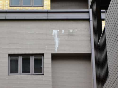 A5-19樓外牆(面B棟)流出一大片白色的東西,B棟高樓層電梯間看的很清楚(從中庭要仔細才看得到),已找管理中心人員來看過,管理中心也已通報遠雄,昨天和遠雄工務部門聯絡,其答覆很難令人接受--------好像那是自然現象。我說若是自然現象,那為何未見別棟甚至別的社區也會有此現象?