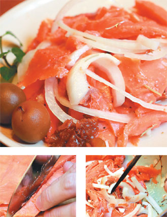 3.將燻鮭魚薄片加入備好的調味料中,混合均勻;調味料應淹過燻鮭魚片。