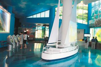 記者牟玉珮/攝影遊客一進探索館,就可感受到色彩繽紛的活潑氣息,門口1座頂天立地的帆船,轉個彎還有艘大遊艇,天花板懸吊著兩名潛水員,一旁還有潛水艇,民眾透過電腦及立體互動地景模型,可以瞭解北海岸的旅遊資訊,館內還重現野柳女王頭、綠石槽、豆腐岩等。