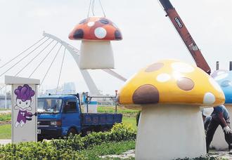 台北市長郝龍斌昨天上午視察花博大佳園區撤離情形,宣布將在本月二十日開放。大太陽下,工作人員吊走花博磨茹,遷移到溪山國小再利用。