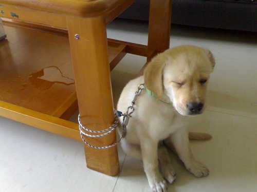 還好今天早上一起床 我發現他真的沒有智商低的問題 因為平時他都在原地 也就是他睡的地板上亂尿 每次我一起床 看他全身沾滿了尿很臭 就會馬上帶他去洗澡 他就這樣過了13天 沒想到第14天的早上看到這一幕 看到桌底下那泡尿 我笑了 他大概怕每天洗澡吧 這才知道我家拉拉開竅了 這次尿在桌底下 離他比較遠 不會弄得全身臭臭 就可以不必洗澡 哈哈 喜從天降 我出運了