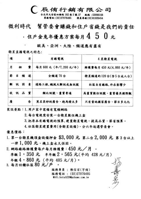 辰侑行銷有限公司報價:機上盒1000元,維護費405~450元,月回饋社區80元/戶,衛星設備費用分6年返還社區。
